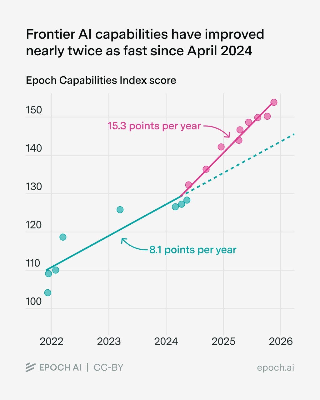 That’s not the only way it’s accelerating either. According to one index that measures AI abilities, these started to accelerate significantly in 2024—and are carrying on to the present day. Jumping from 8.1 points improvement per year, to 15.3 point per year. Almost doubling. And if I were a betting man I’d say 2026 will see that increase again, by a lot.