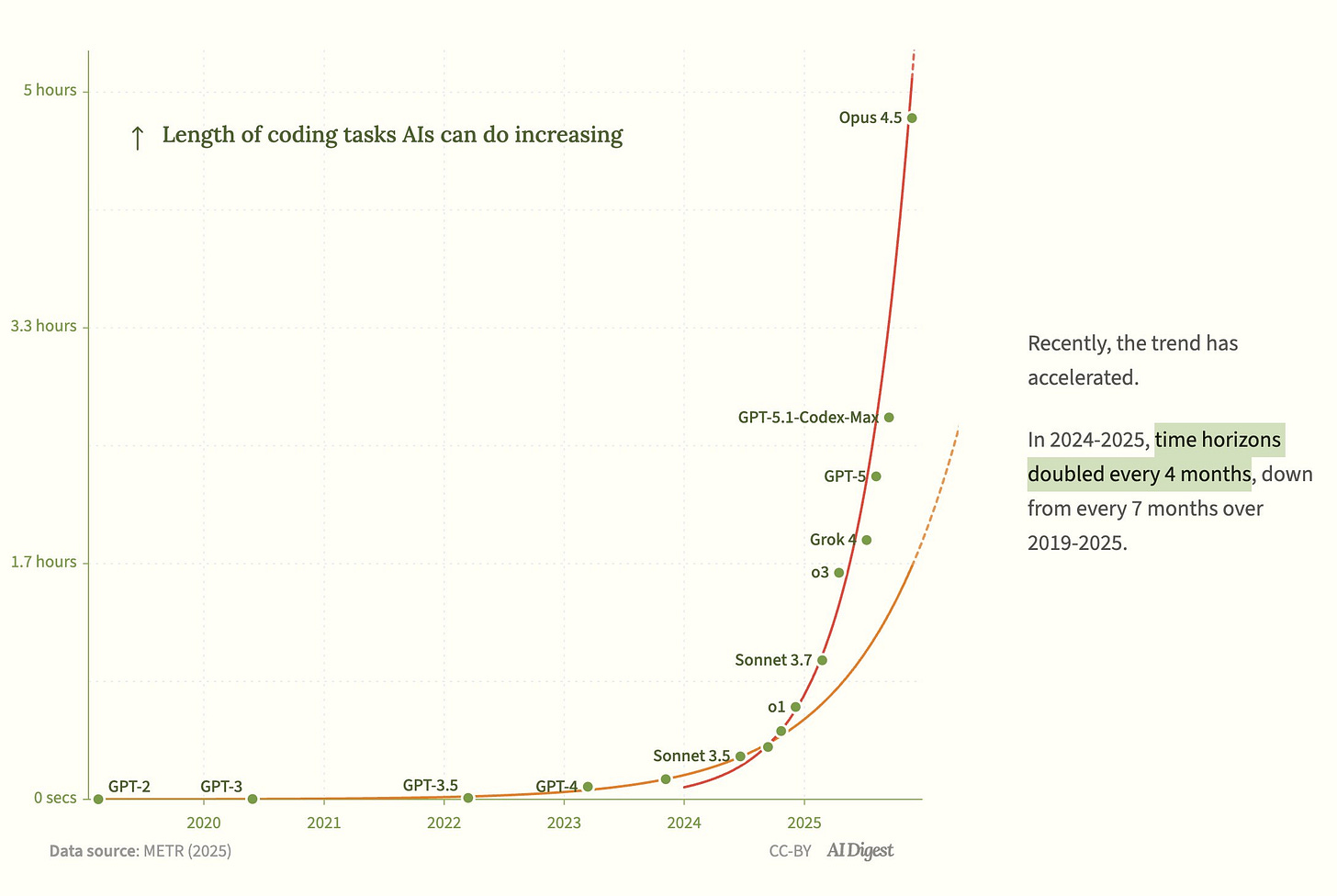 The length of time an AI agent can work on a coding task isn’t just increasing exponentially, the rate of acceleration is itself accelerating. Between 2019 and 2024 the task duration AI was capable of doubled every 7 months. Between 2024 and into 2025 it’s every 4 months. In case you were wondering, an increase of acceleration over time is called jerk (or sometimes jolt). So I guess we’re jolting forward? By the end of 2026 an AI will be able to keep working independently for half a week on coding tasks, unless of course they can go for even longer (if the jolt keeps increasing).