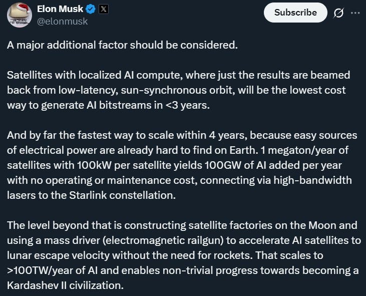 To win the AI race you need the most compute, data, and energy. Everyone is working within the same constraints: there’s just one internet, just one GPU provider, same competition over data centers, energy suppliers, etc. Space changes all this. You can mass produce satellites and they all talk to each other in a swam via laser links. The major AI models are all within a few months of each other in terms of competency. There is no company even within a decade of in terms of launch capacity or cost. Going all-in on space-based data centers completely circumvents the bottlenecks everyone else faces. Overnight the competitive landscape has shifted from ‘neck and neck race’ to ‘10 year advantage to SpaceX and xAI.’ The game is already won. It’s already checkmate. Elon is all-in on SpaceX going public to raise capital to go all-in on space-based compute. Of course they will win at this point. They own the launch capacity, therefore they will own the compute capacity, therefore they will win the AI race.