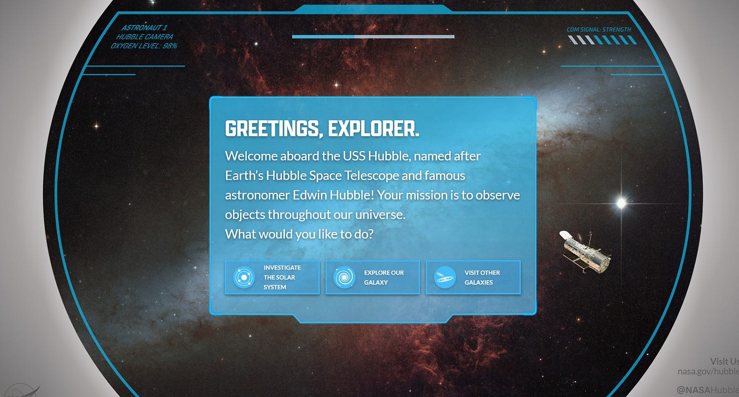 The first looks great for all ages. NASA has put together a neat little page called Hubble’s Cosmic Adventure. You board the virtual ship the USS Hubble, named after the famous telescope (and astronomer too of course), and choose a location to explore. You then travel to your chosen destination, where you can learn about various astronomical objects and phenomenon. (NASA)