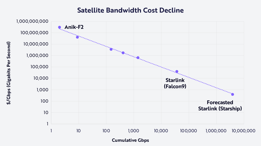The cost of satellite bandwidth has dropped significantly over the years, from $300 million for a Gigabit/second to merely $40k. With SpaceX’s Starship expected to come into service soon, those numbers could drop another 40-fold to around $1,000/Gbps by 2028. (Human Progress) (Gale Pooley)