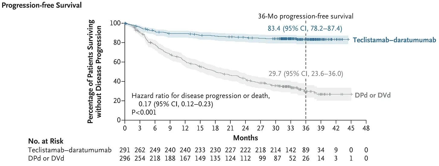 Two incredible pieces of news for treating multiple myeloma, which as some of you may remember is a cancer I take particular concern with. The first is a study showing that Daratumumab and Teclistamab, a monoclonal antibody and bispecific antibody treatments respectively, work incredibly well together. After 3 years the progression free survival rate (i.e., no relapse) was 83.4%, whereas it was only 29.7% for the standard treatment. As a treatment for patients who have had at least one relapse, this is far better than anything else available right now—as far as I know anyways. The second is an early stage trial where 18 patients were given an antibody called linvoseltamab (a different bispecific antibody). After a few treatment cycles, none of them had detectable disease. The study lead said that based on his experience, he “would predict that after having such a good response after such a short time, the disease most likely could stay away for many years. Could it never come back in some patients? I would say it’s possible.” (The New England Journal of Medicine via Samuel Hume) (Miller School of Medicine)