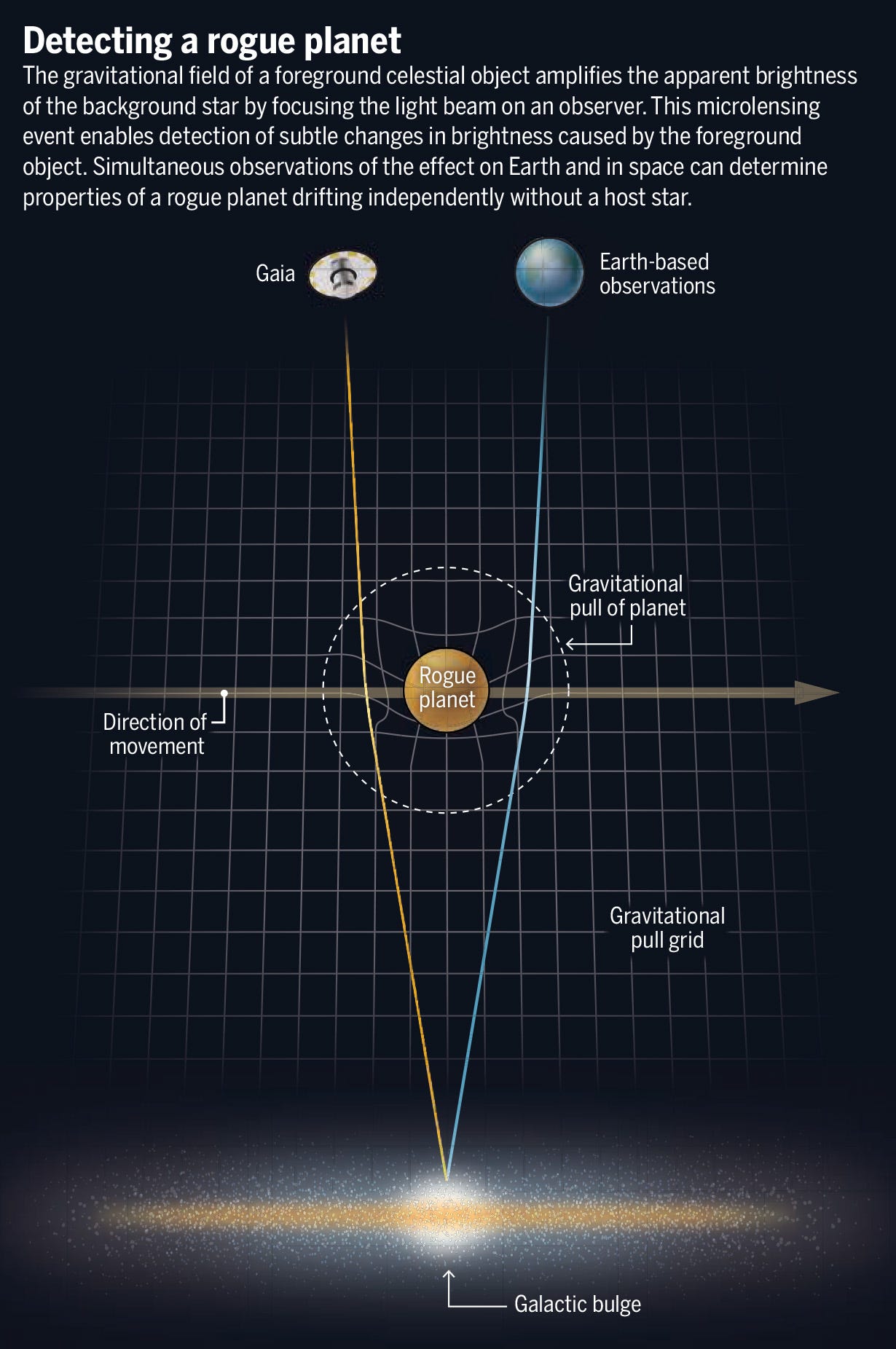 For the first time ever, astronomers have measured the mass of a rogue planet wandering the Milky Way by observing a microlensing event simultaneously from Earth and space, combining ground surveys with data from the Gaia space telescope to nail down both its mass and its location. The object is about 22 % the mass of Jupiter (Saturn-like), and located roughly 3,000 parsecs (~9,785 light years) from the galactic center. It likely formed around a star before being flung into interstellar space by gravitational chaos within its system, instead of forming alone like a brown dwarf, which are considerably larger. This measurement opens a new window on the population of rogue planets, helping scientists understand how planetary systems eject worlds and how common these nomads really are. (Science Magazine) (Science Daily)