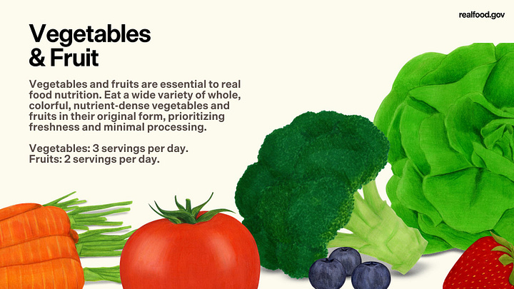 The federal government just published new Dietary Guidelines at realfood.gov that inverts the old, bad advice. The newly designed new pyramid prioritizes protein, dairy, and healthy fats at the base—recommending 1.2-1.6 grams of protein per kilogram of body weight daily from meat, eggs, seafood, full fat dairy [Sidebar: I came across a recent study linking full fat cheese and cream to a lower risk of dementia], nuts, and avocados. Vegetables and fruits come next (3 and 2 servings daily), with whole grains reduced to 2-4 servings and refined carbohydrates explicitly discouraged. The guidelines explicitly call out “the dangers of highly processed foods” and define real food as “whole, nutrient dense, and naturally occurring,” prepared without added sugars, industrial oils, artificial flavors, or preservatives. Added sugars get eliminated entirely, especially for children.