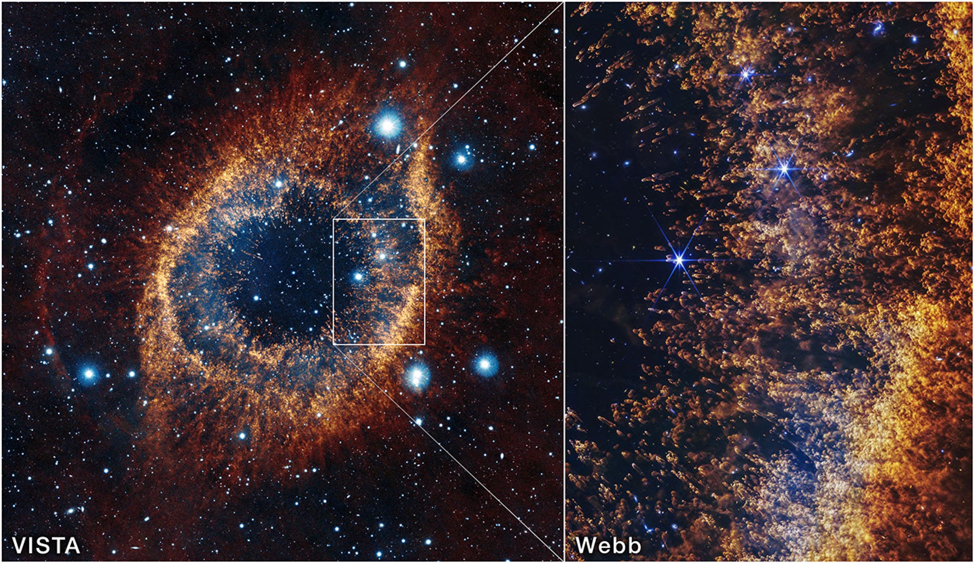 This closeup of the Helix Nebula by NASA’s James Webb Space Telescope is just stunning. “Pillars that look like comets with extended tails trace the circumference of the inner region of an expanding shell of gas. Here, blistering winds of fast-moving hot gas from the dying star are crashing into slower moving colder shells of dust and gas that were shed earlier in its life, sculpting the nebula’s remarkable structure.” (NASA)