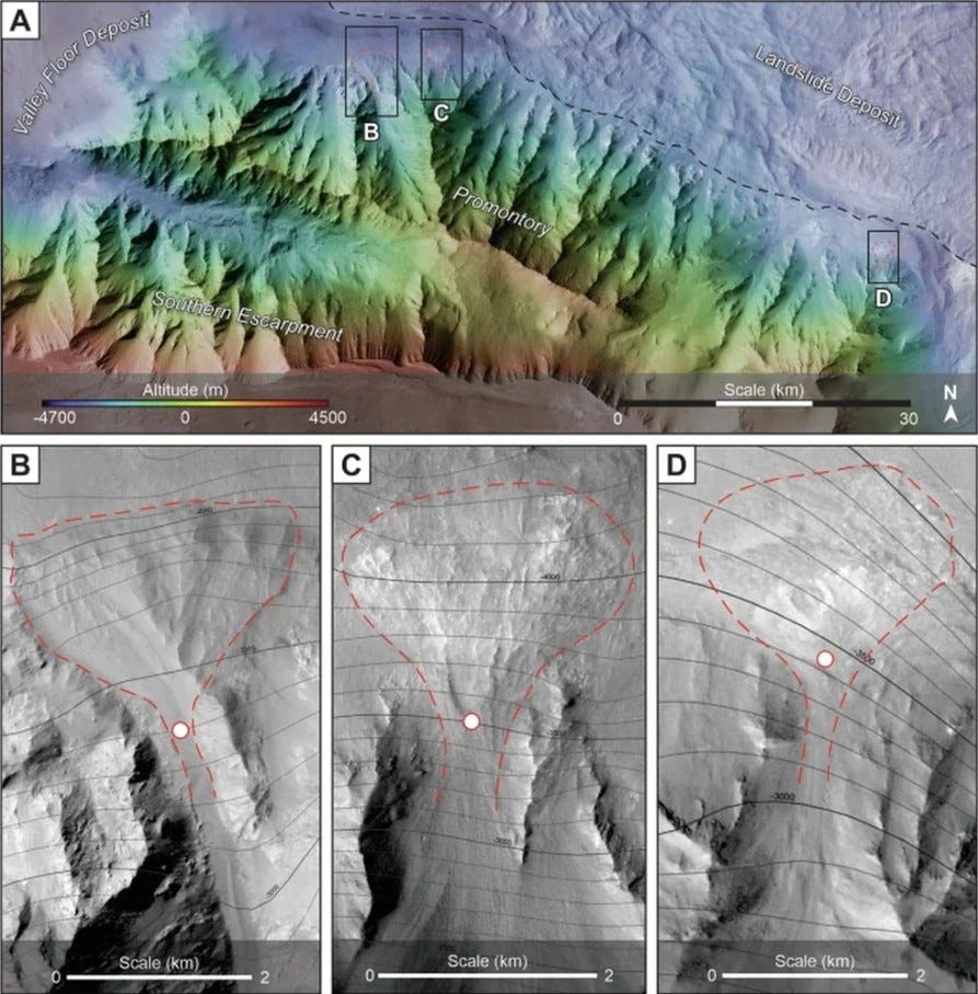 Meanwhile, University of Bern researchers discovered river deltas in Valles Marineris—the Solar System’s largest canyon—that mark where rivers once emptied into a vast ocean covering half of Mars about 3 billion years ago. Using high resolution images from ExoMars Trace Gas Orbiter, Mars Express, and Mars Reconnaissance Orbiter, the team identified three fan shaped sediment deposits, matching the geometry of Earth’s river deltas perfectly. The structures that were able identified in the images clearly appear to be at the mouth of a river as it empties into an ocean. That ocean was at least as large as Earth’s Arctic Ocean, and since Mars is roughly half Earth’s width, it covered an enormous fraction of the planet’s northern hemisphere. Similar delta deposits have been found elsewhere on Mars, all lining up along the same elevation band stretching hundreds of kilometers—essentially tracing an ancient Martian shoreline.