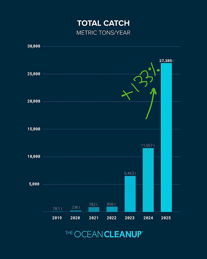Looks like private non-profits are doing a way better job than governments again, with a company called Ocean Cleanup estimating that they intercepted between 2-5% of global plastic pollution en route to the ocean. Founder Boyal Slat thinks they should be able to double that number in 2026. Ocean Cleanup says they “aim to put ourselves out of business…To achieve this goal, we employ a dual strategy: intercepting in rivers to tackle the sources of ocean plastic pollution, and cleaning up what has already accumulated in the ocean and will not go away by itself.” Good on them. (Boyan Slat) (Ocean Cleanup)