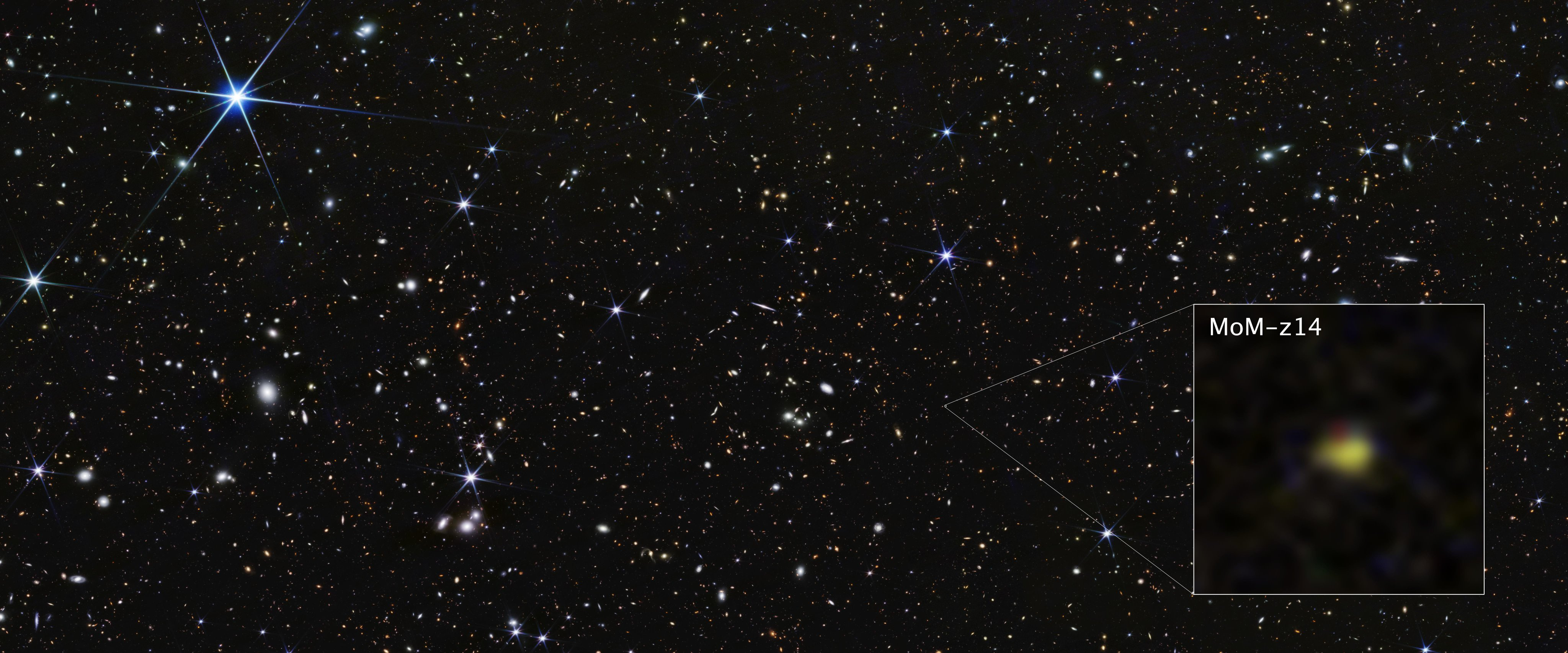 This is a small galaxy called MoM-z14, and it’s the new record holder for the farthest (and therefore oldest) galaxy we’ve ever seen. That little yellow smudge is light coming from stars that were shining just 280 million years after the Big Bang. That, ladies and gentlemen, is what we call deep time. (NASA Webb Telescope)