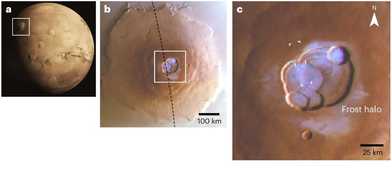 Morning frost has been detected for the first time in the calderas and on the rims of the Tharsis volcanoes (Olympus, Arsia and Ascraeus Mons, and Ceraunius Tholus), the largest volcanoes in the Solar System. Color images and spectral observations both confirm the presence of frost during the colder seasons of the Martian year; and given that the volcanoes are not active (ruling volcanic outgassing out as a likely culprit) it means the frost came from water vapor in the atmosphere. This is particularly important because these volcanos are near the Martian equator, meaning there could be more water around than expected for future human explorers and settlers. (Nature) (Space.com)